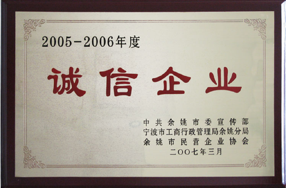 2007年3月,被中共余姚市委宣傳部、寧波市工商行政管理局余姚分局、余姚市民營企業(yè)協(xié)會(huì)聯(lián)合評定為2005-2006年度“誠信企業(yè)”