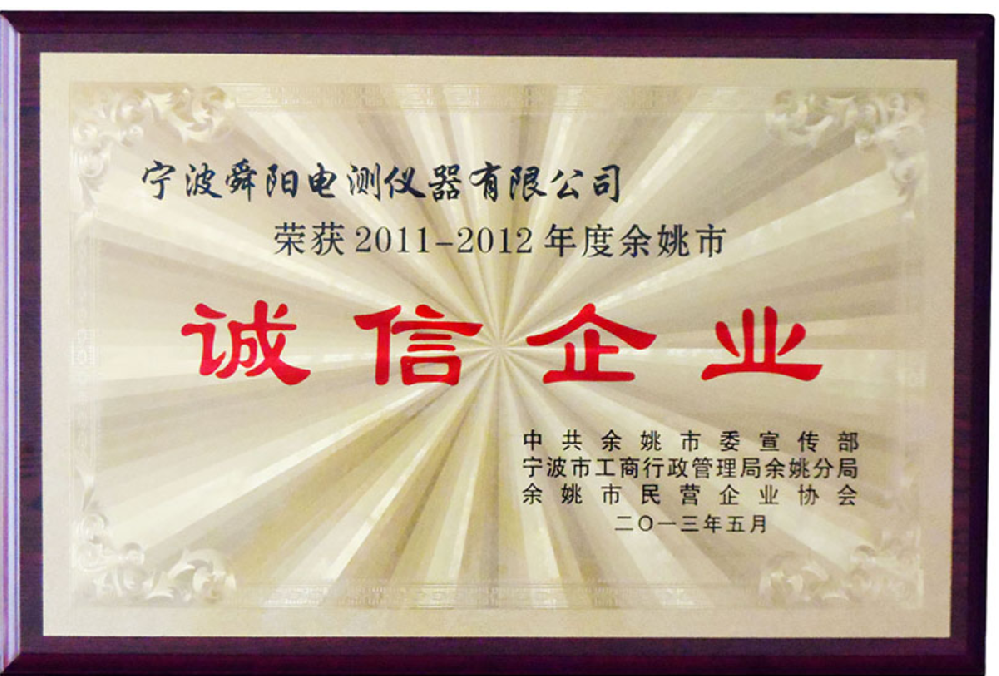 2013年5月,被中共余姚市委宣傳部、寧波市工商行政管理局余姚分局、余姚市民營企業(yè)協(xié)會(huì)聯(lián)合評定為2011-2012年度余姚市“誠信企業(yè)”